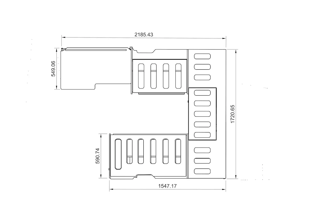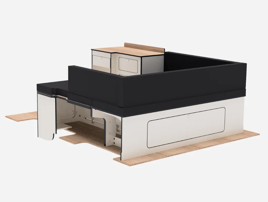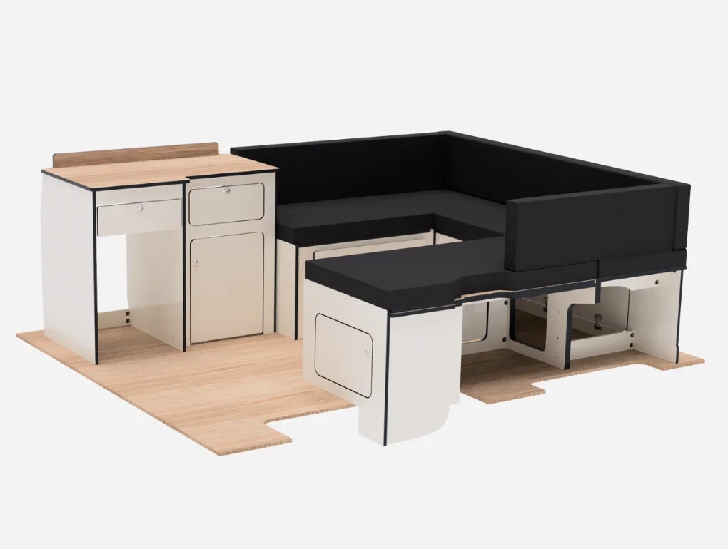 A Ford Transit Custom SWB U-shape bed system which includes a pod with space for a fridge and a worktop with an optional sink/hob.