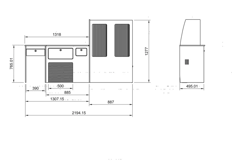 A full side unit with 3 tambour doors, 1 drawer, a table system, an over hob locker, and an overhead locker.