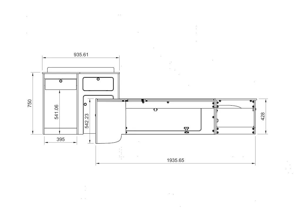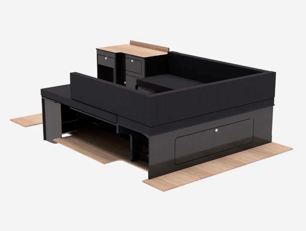 A VW T7 LWB U-shape bed system which includes a pod with space for a fridge and a worktop with an optional sink/hob.